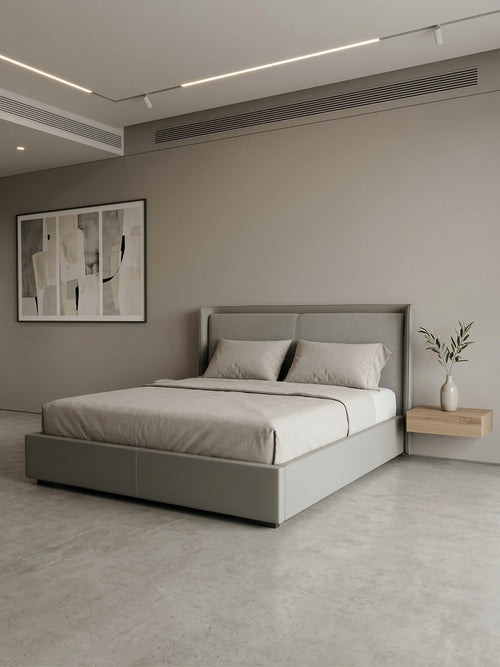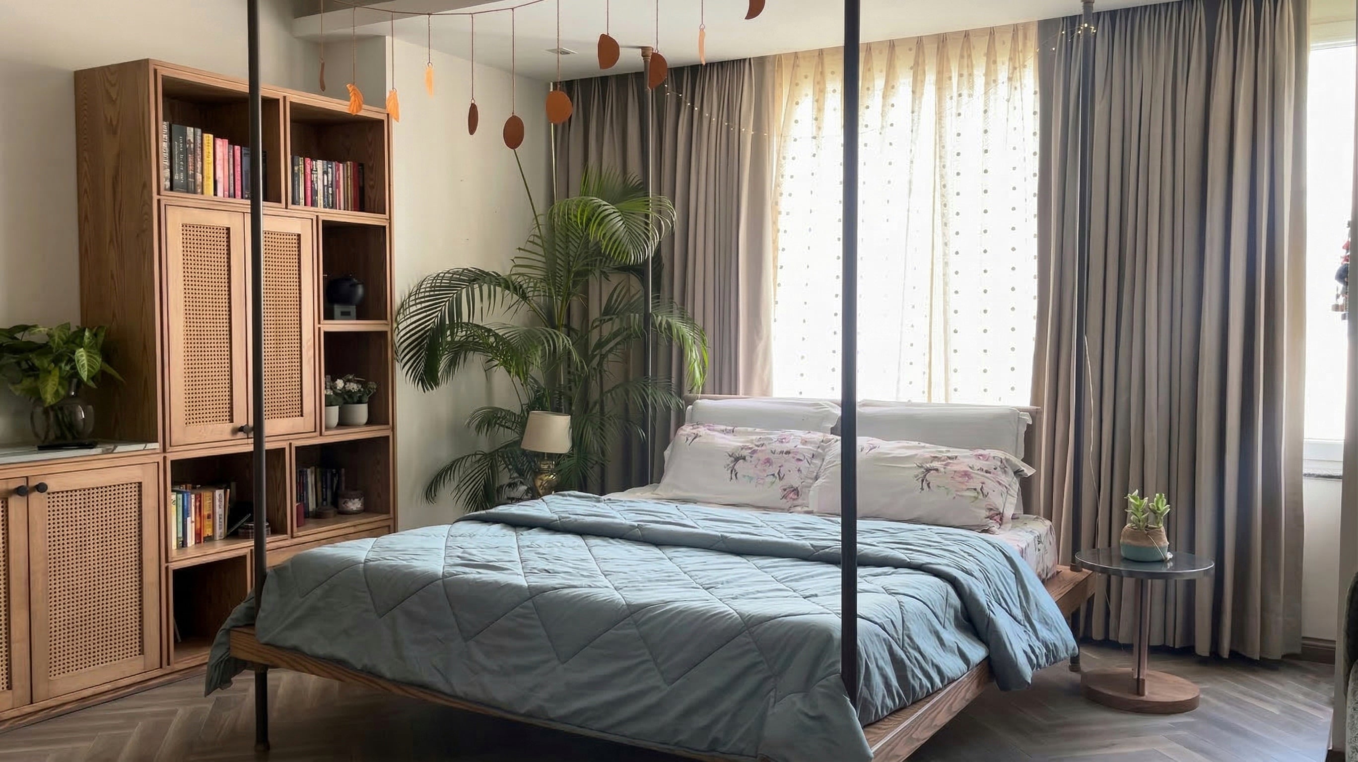 The minimalist four-poster bed serves as a structural centerpiece, balancing strength with an airy, weightless aesthetic. Every joint is hand-finished to ensure a seamless silhouette that defines the modern sanctuary.